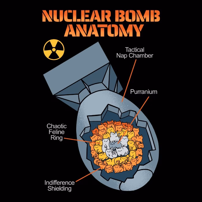 Regalo original sobre Nuclear bomb anatomy cat parody. Camisetas, sudaderas, pegatinas / stickers, gorras, mochilas, bolsas, totebag, paraguas, tazas, cojines, y alfombrillas con el diseño Nuclear bomb anatomy cat parody. Perfecto para regalo de cumpleaños, día del padre / madre, eventos, fiestas, navidad, etc.